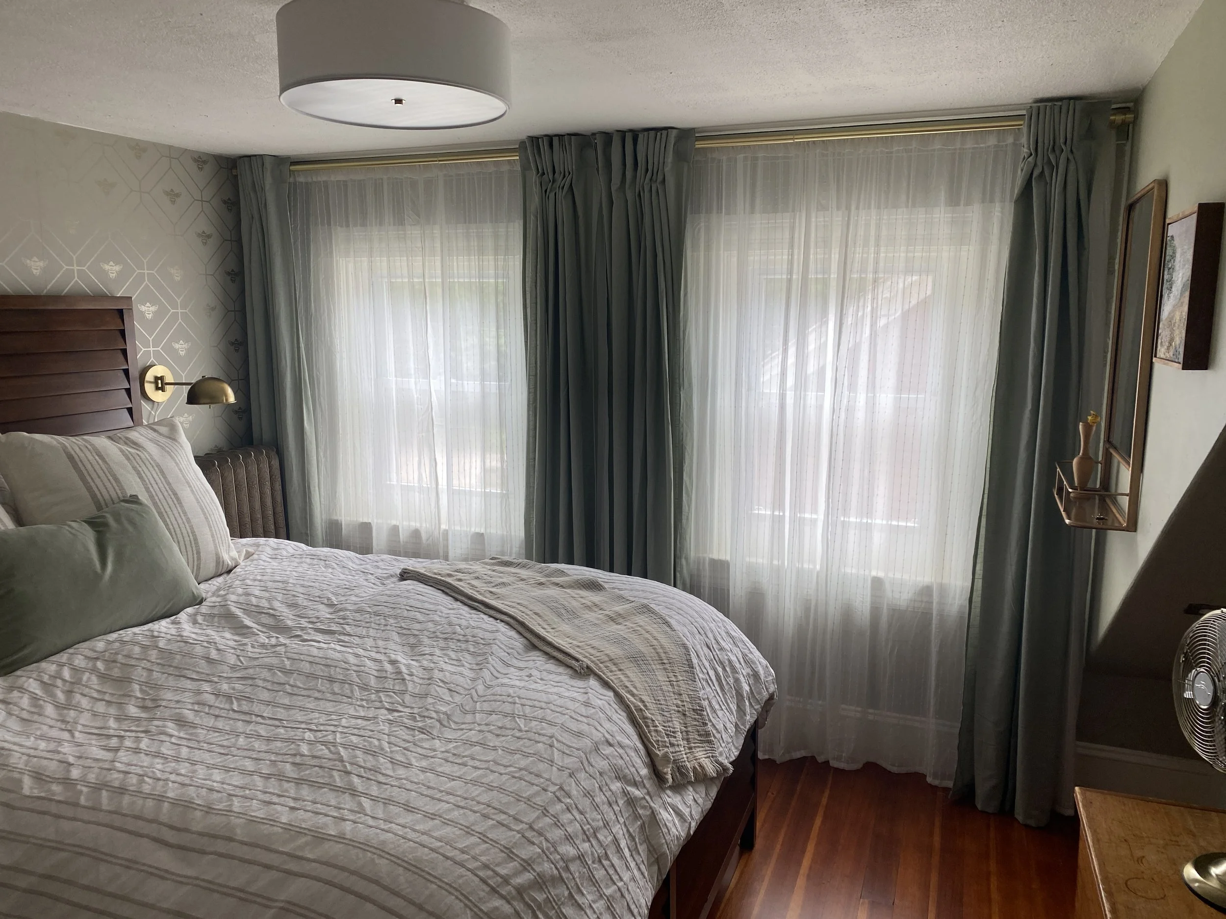 Add a little function, but not too much: As a small room, options for furniture in this space were limited, rather than adding a wardrobe or dresser which would each take up a good chunk of the room, this design called for a deep clothing hook on the wall behind the door. This allows guests to hang a few garments to avoid wrinkles without a bulky piece of furniture that would go mostly unused. A blanket chest in the room houses extra blankets and pillows and provides a place to open a suitcase. The brass mirror has a small shelf where guests can get ready in the morning and store any products they may need, and the gate leg table folds up to serve as a writing surface or tucks away for more space in the cozy room. A small tv was added to the room in case guests want a little alone time. This smart tv is pre-connected to the homeowners streaming services each of which has a profile labelled “Guest Room”.